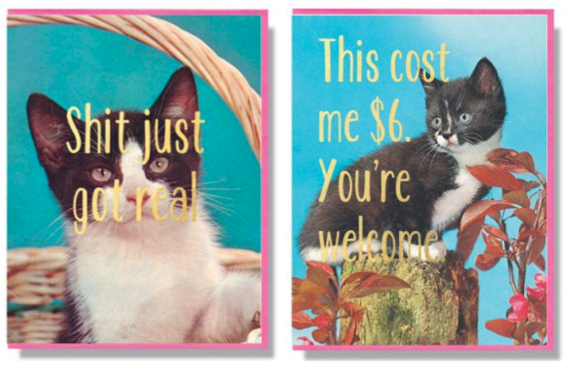 Smitten Kitten is a Toronto based (Yay!) design studio who offers a variety of papergoods and gifts with an eye for pairing cute cats with the most appropriate, or inappropriate depending on your mood, occasions. I really love the juxtaposition of innocence with adult themed humor. Who wouldn’t want to receive a card with a a cute kitty telling them “Shit just got real” or “You fill my heart-hole with love”? Cards are blank inside so you can write a complimentary message should you choose.